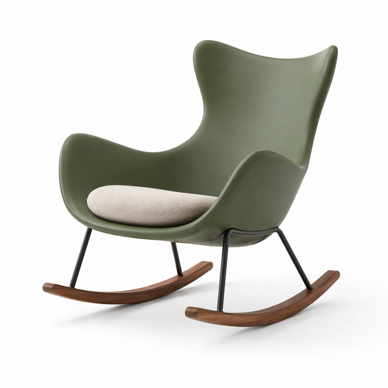 Der Schaukelstuhl besteht aus langlebigem Kunststoff mit einer Sitzpolsterung aus Polyester. Die Beine sind aus Walnussholz gefertigt.
