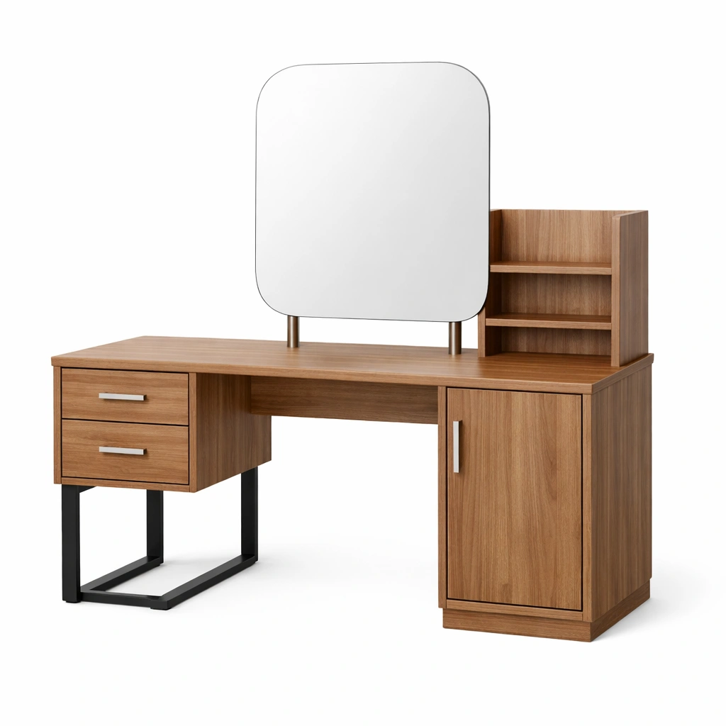 Schminktisch bestehend aus Holzfurnier mit Metallrahmen. Der Tisch verfügt über zwei Schubladen und ein Schrankfach, sowie offene Regalfächer. Der integrierte Spiegel ist aus 4 mm dickem Klarglas gefertigt.
